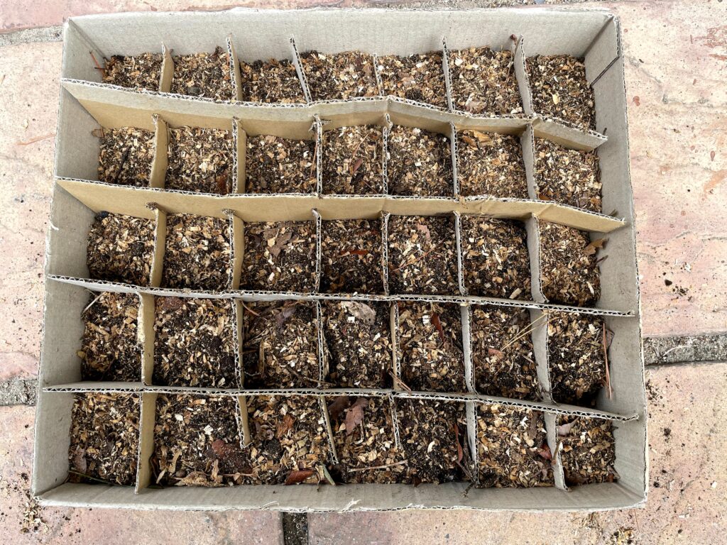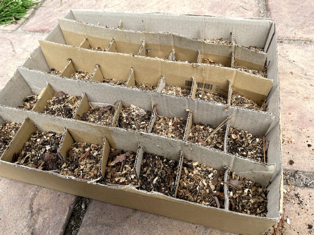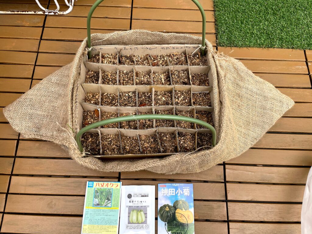 そして、土から1センチくらいの深さに種を植え付け、保温のために麻袋をまいて完了です。