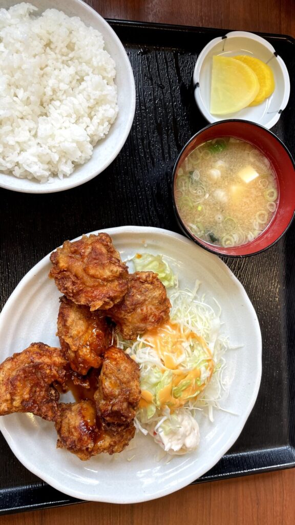 ビールが最高。そして定食屋(たかお食堂)で唐揚げ定食650円を注文。