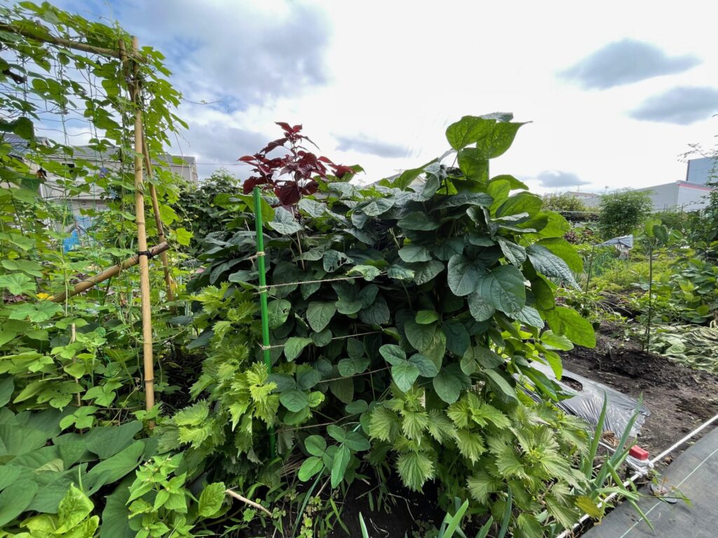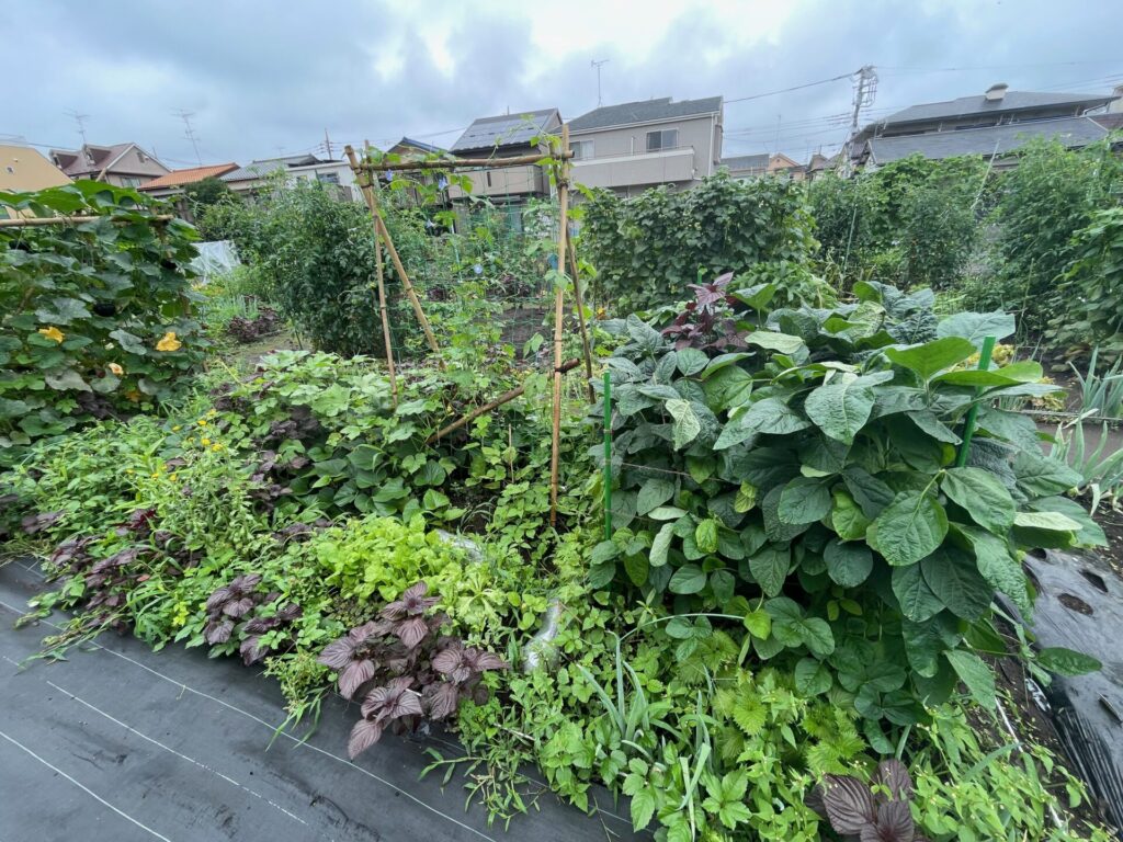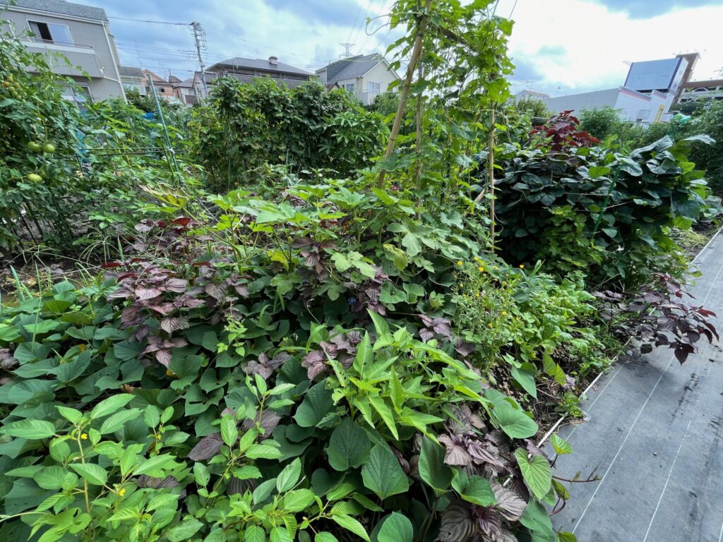 なにもしなくてもどんどん育つサツマイモ。手入れは楽だがツルが伸び放題で周りの野菜に日が当たらなくなることがしばしば。こんなに爆発するとは思いませんでしたので来年はやるとしても規模を縮小します。11月くらいの収穫が楽しみです。