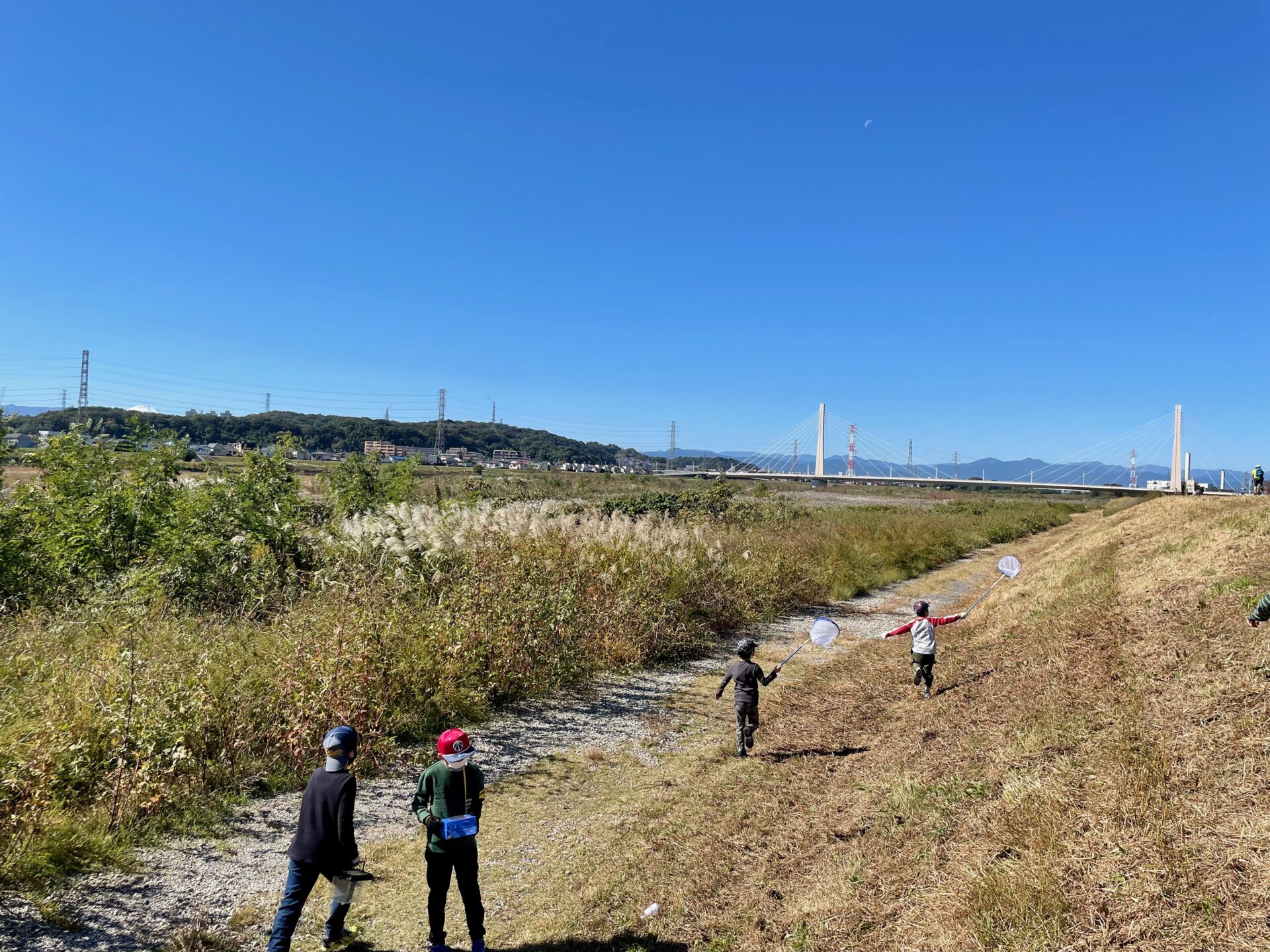 虫取り網と虫かごを持ち、トンボやバッタ、蝶々などを捕まえていると、そのうちの一人が「わぁ、なんかこれってあつ森みたいだね」と言い出しました。そしてそれに賛同した他の生徒たちも「あつ森の世界にいるみたいだね」と共感していたのです。